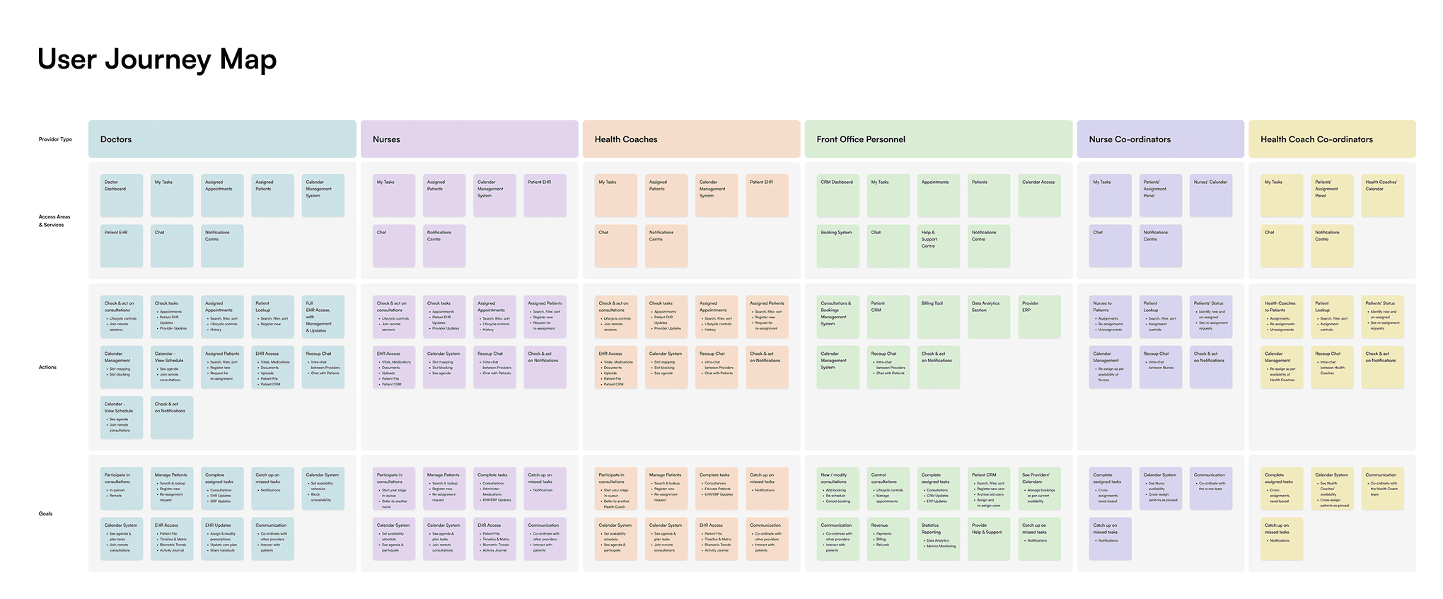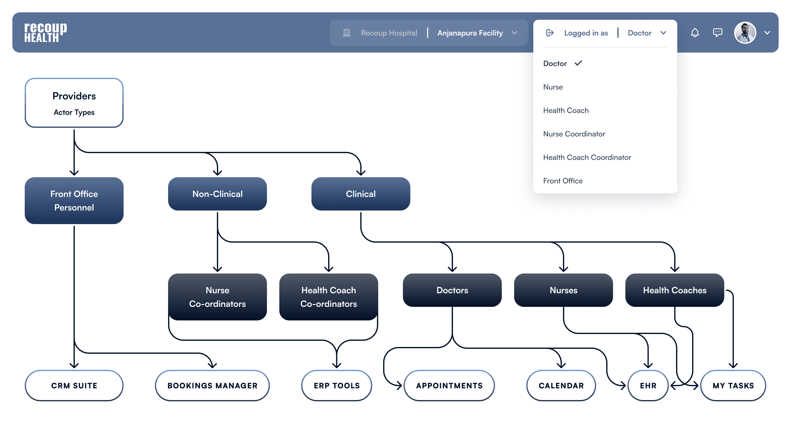 There are six Provider Actor Types – Doctors, Nurses, Health Coaches, Nurse Co-ordinators, Health Coach Co-ordinators, and Front Desk Personnel.